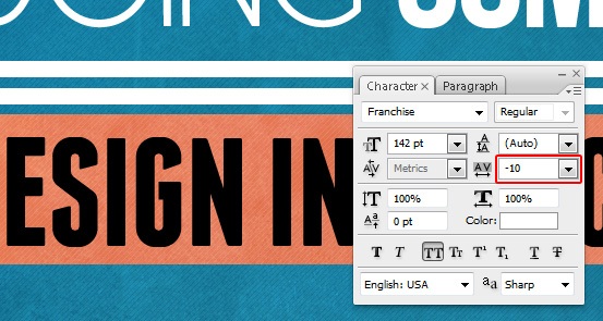 Switch back to the Horizontal Type Tool (T), set the font to Franchise at 142pt size and write out "DESIGN INSTRUCT" below the two underlines. In the Character Panel, set the Tracking to -10.