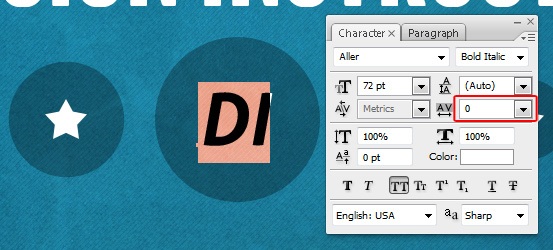 Use the Horizontal Type Tool (T) with Aller (Bold Italic) at 72pt size and 0 Tracking to write "DI". Place the text at the center of the biggest circle.