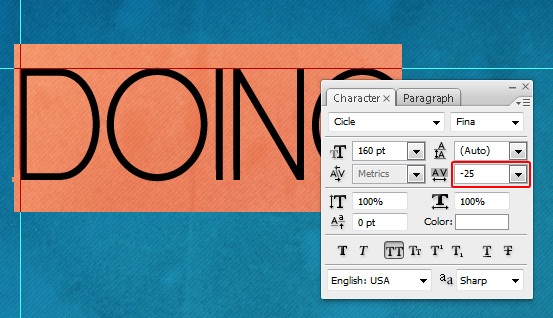 First, set you Foreground color to white (#FFFFFF). Switch to the Horizontal Type Tool (T), choose Cicle (Fina) as your font and set the font size to about 160pt (do this in the Options Bar) and then write the word "DOING". Then go to Window > Character to open the Character Panel (if it isn't opened already) and set the Tracking option to -25, which will reduce the spaces between the characters.