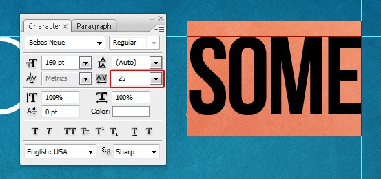 Now choose Bebas Neue (Regular) at 160pt size font and write the word "SOME". In the Character Panel, set the Tracking option to -25 as well.
